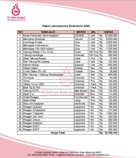 Membangun laboratorium klinik sederhana membutuhkan perencanaan yang tepat, pemilihan peralatan yang sesuai, serta anggaran yang efisien. Untuk membantu klinik, puskesmas, atau fasilitas kesehatan memulai layanan pemeriksaan laboratorium, PT Sifin Medikal Diagnostika menghadirkan Paket Pembuatan Laboratorium Klinik Sederhana yang siap pakai.